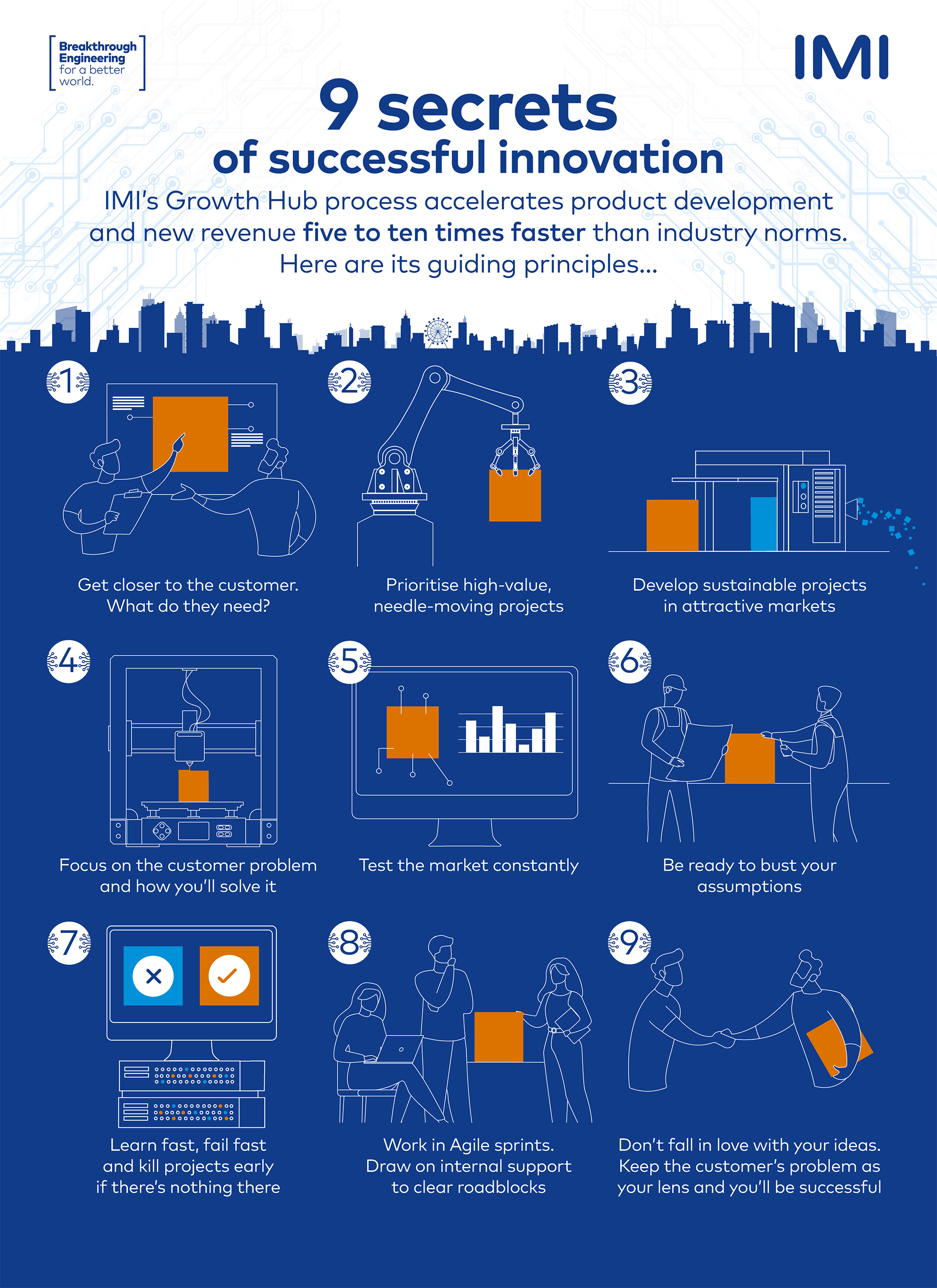 Innovation is essential for business success. Received wisdom says that it’s lean start-ups that are best at disrupting the status quo, while well-established companies do better by optimising their products or services. IMI has turned these assumptions upside down with its Growth Hub process. Since 2018, a series of sprint cycles and stage-gated processes focusing on solving real, industry problems have generated millions of pounds worth of new business.
