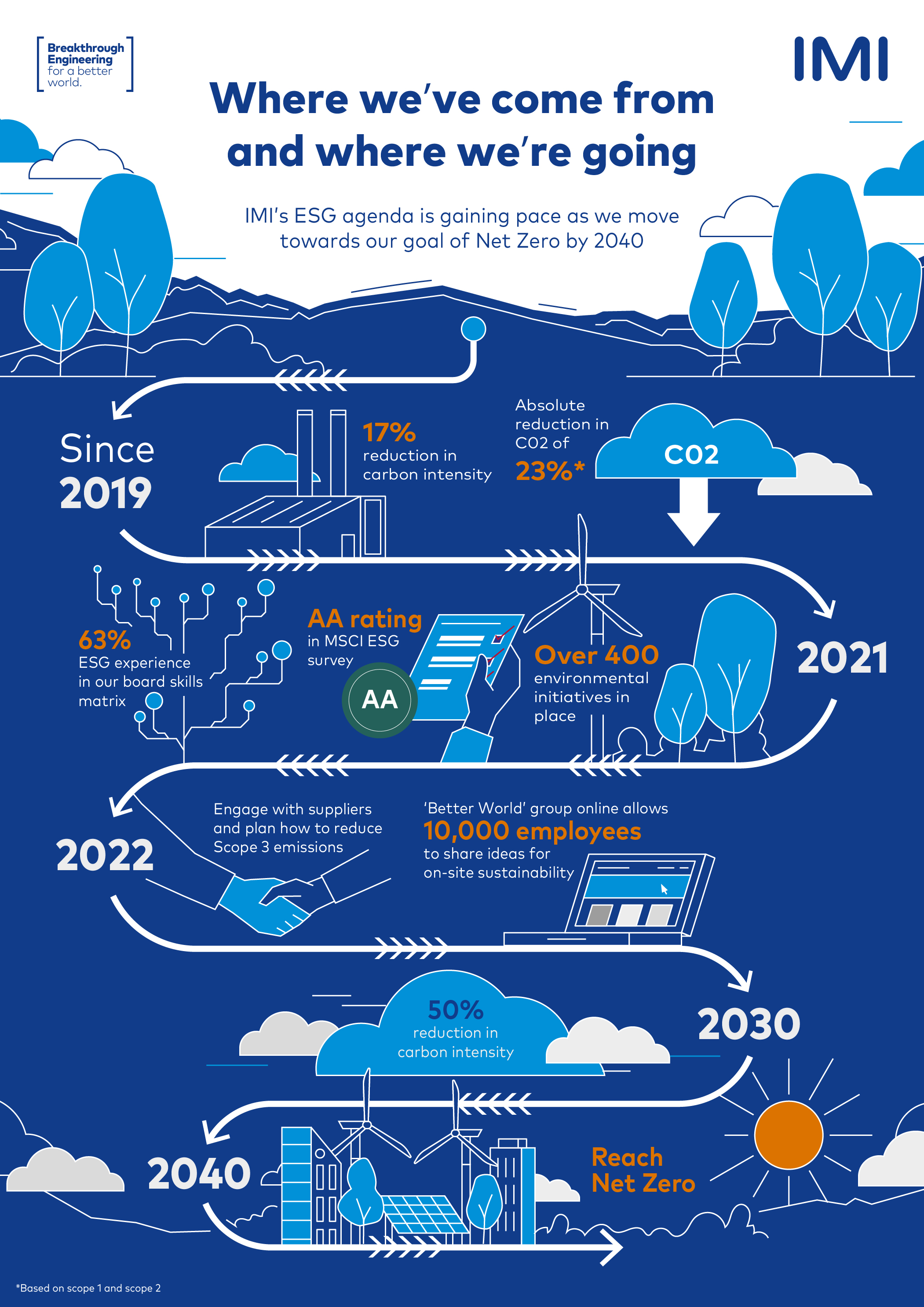 To help reach its goals, IMI is embedding sustainability in its operations: all divisions now have a dedicated ESG lead or working group and all sites have a nominated ESG champion.